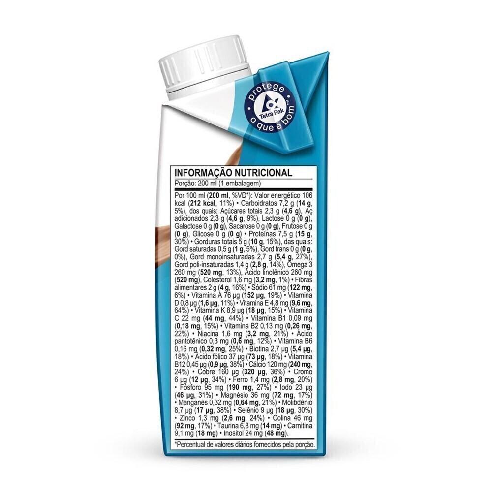 Alimento pronto para o consumo diet, com isomaltulose, um carboidrato de lenta absorção com baixo índice glicêmico, rico em proteínas (15g/200mL) e fonte de fibras, ômega-3 e vitaminas e minerais. Isento de sacarose, frutose, glicose e lactose. Sabor Chocolate.